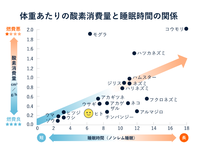 動物の睡眠時間には種類ごとに大きな差があるのをご存知ですか?グラフに示したようにゾウやウマの睡眠時間がわずか2時間ほどなのに比べてネズミやハムスターは10~12時間という長さ。この違いは「酸素消費量」、つまり体重あたりのエネルギー消費量と関係しています2)。体は小さくてもエネルギー消費量が大きいネズミは大量のエサを食べても、どんどん消費してしまう、いわば燃費の悪いクルマ。だからエンジンを極力動かさない時間=睡眠が長くなり、一方ゾウは大型ダンプながら燃費に優れたエコカーだから長時間起きていても平気なのです。