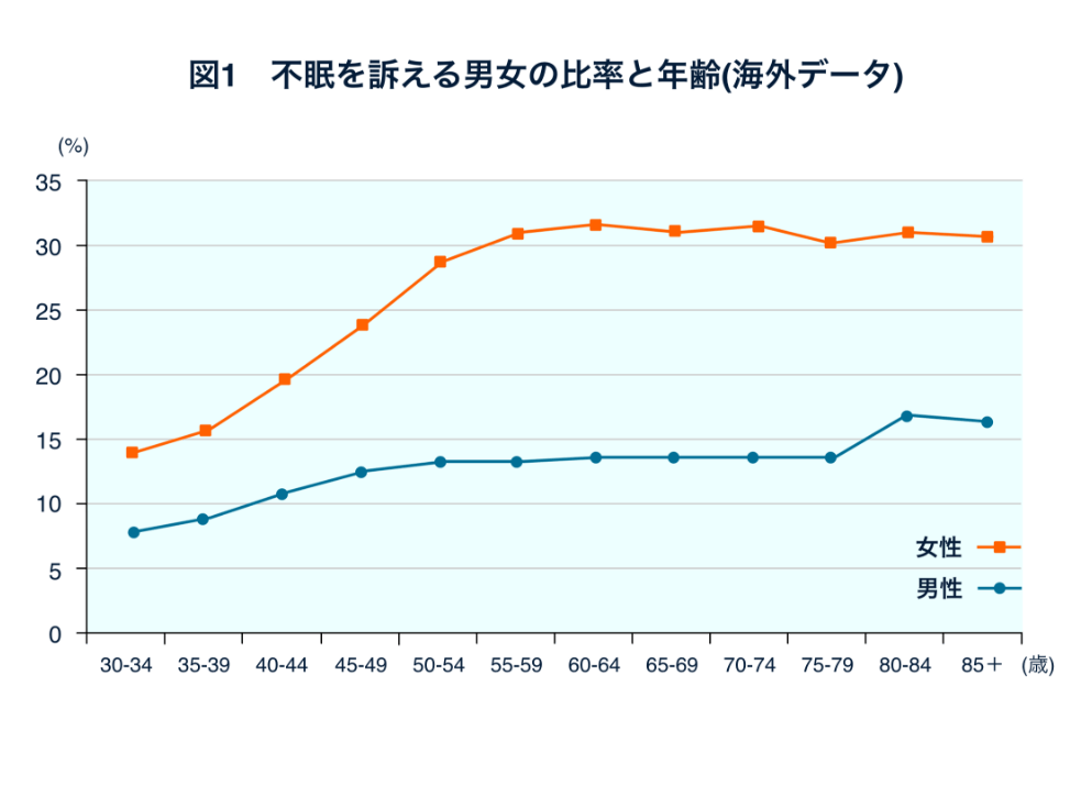 アメリカで行われた100万人以上を対象にした調査1)では、不眠の訴えは、どの年代においても男性より女性のほうが多く、かつ50歳前後で急速に増えていました(図1)。また、厚生労働省が行った平成元年の国民生活基礎調査2)をみると、40代、50代の女性では、睡眠時間が少なくなる傾向がありました。どちらの調査も主観的な訴えに基づいたものですが、女性のほうが不眠を訴えたりする割合が高く、更年期になるとその訴えが増える、ということが言えるかもしれません。