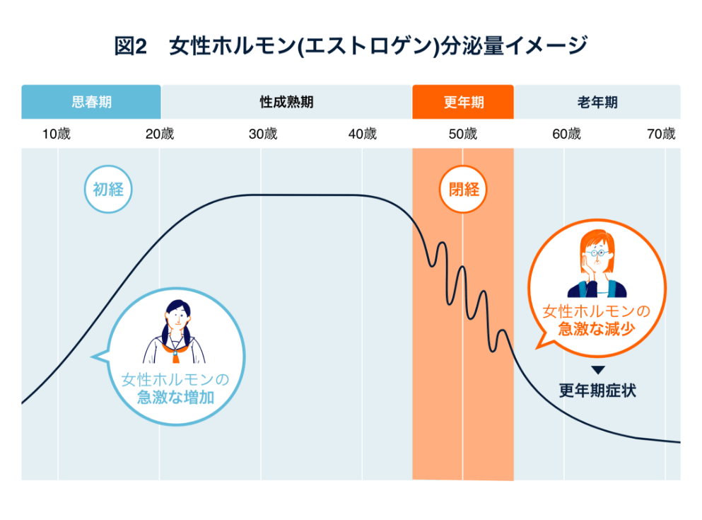 女性の不眠の原因の一つには、女性ホルモンであるエストロゲンの影響が考えられます。女性の生涯においてエストロゲンの分泌量が大きくゆらぐ時期は「初経の時期」「妊娠・出産の時期」「閉経の時期」ですが、特に閉経前の5年間と閉経後の5年間とを併せた更年期にエストロゲンの分泌量は乱高下しながら劇的に減っていきます3)(図2)。閉経期では、このエストロゲンのゆらぎに心理的・社会的ストレスが加わるなどして、不眠が起こりやすくなると考えられます。