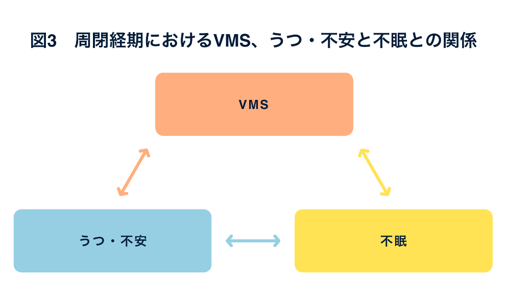 更年期は、図3のように不眠、うつ・不安、VMSという3つの症状が互いに影響し合っています。さらに、エストロゲンのゆらぎや急激な低下がVMSやうつ・不安の悪化に影響し、結果的に不眠を引き起こすことがあります8)。