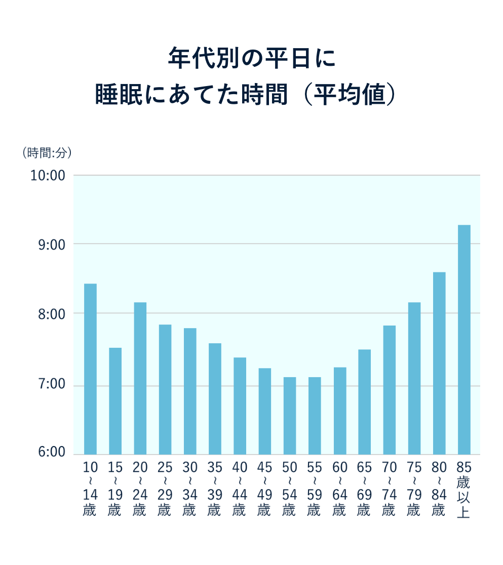 昔から世界中の若者たちの間には、「睡眠をとることはかっこう悪い」「睡眠時間が短い方がスマート」と思う風潮があり、懸命に睡眠時間を削ってきました。総務省統計局が実施した2021年の「社会生活基本調査」7)では、10代後半に睡眠時間ががくんと減り、20代になると再び増える傾向がはっきり示されています。これは非常に不自然な現象で、生物学的にはあり得ません。社会的な影響と考えられます。