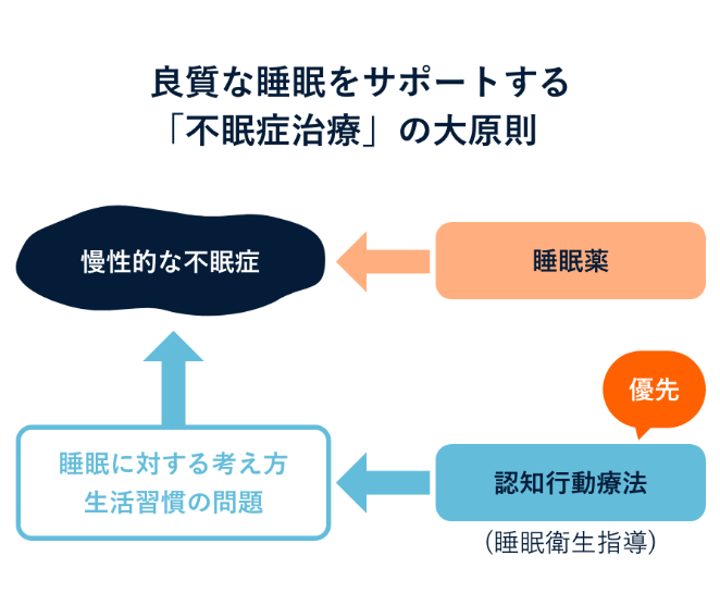 「治療」というと⾝構えてしまうかもしれませんが、不眠の原因を明らかにし、その原因を取り除くサポートをすることが「不眠症治療」の⼤原則です。
