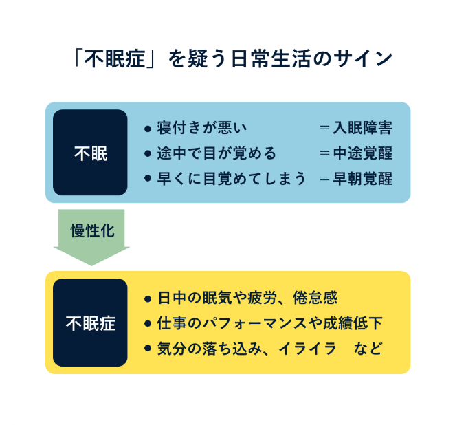 こうした不調を感じて⽇中の⽣活への影響が続いているようであれば、不眠症診療を⾏う医療機関への相談も含めた不眠の原因の改善に向けたアクションを起こす⼀つの⽬安になります。