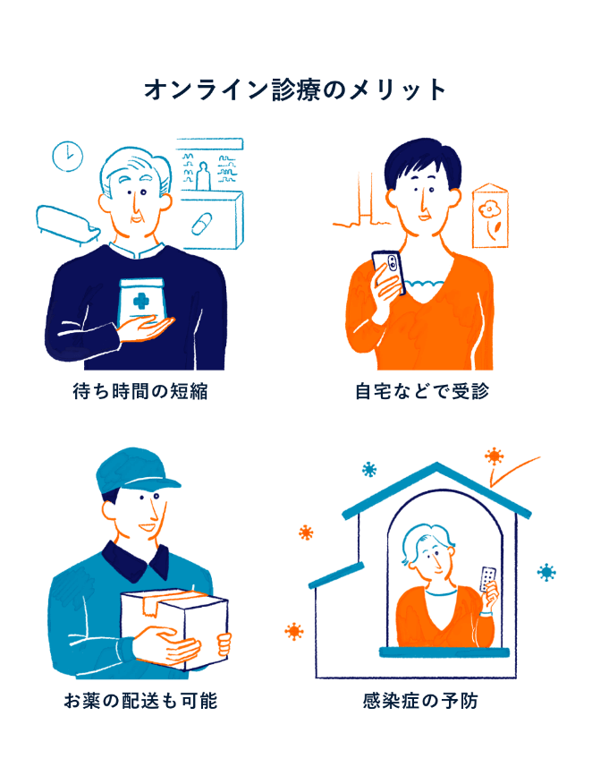 オンライン診療を含めた遠隔医療は、場所や時間を問わず、通院の費⽤や移動にかかる時間を削減し、質の⾼い医療を提供できる点が⼤きなメリットです。患者さんにとっては、⾃宅や職場など、どこからでも医療機関を受診しやすく、受診時間も予約できるため、働きながら仕事の合間に時間をとって受診することも可能です。