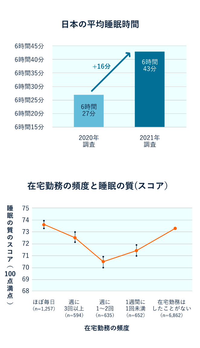 この背景には、特に勤労世代でコロナ禍において働き⽅が変化し、テレワークによる在宅勤務と職場への出勤⽇が混在する⽣活のなかでうまく睡眠のリズムを保てなかったことが⽰唆されています。