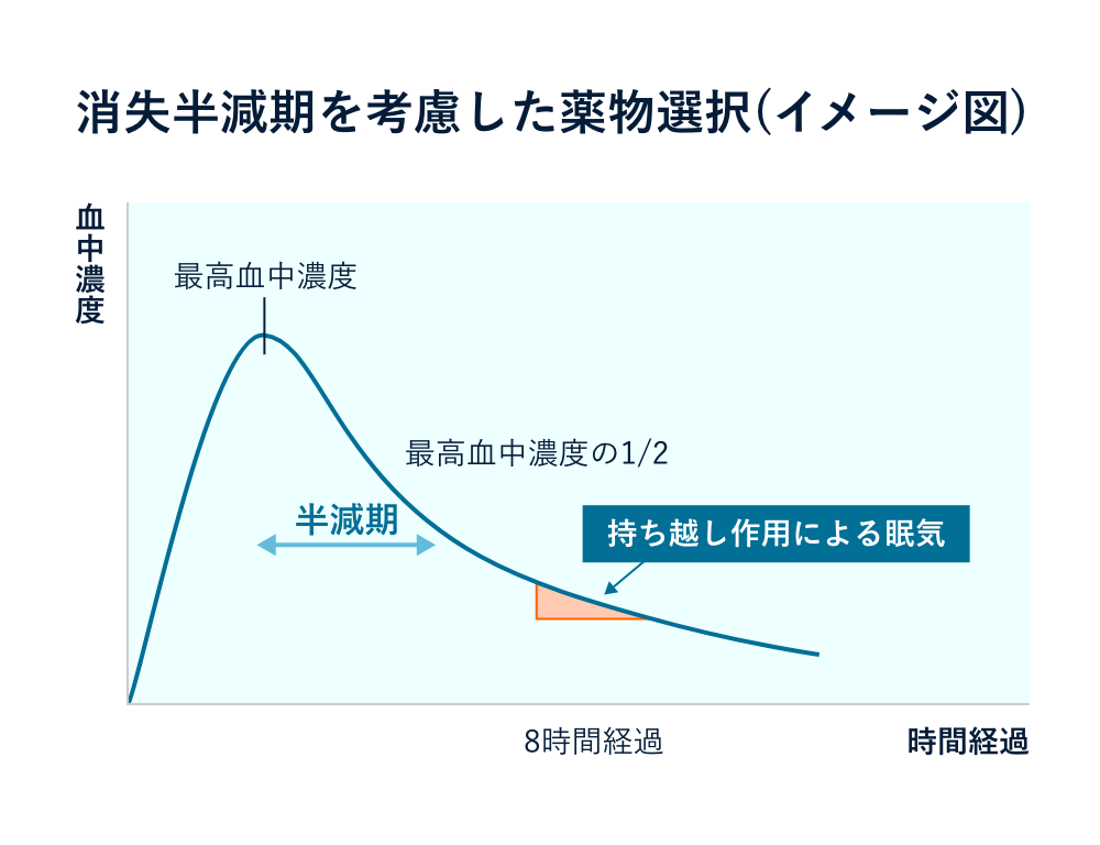 高齢になるとくすりによって異なりますが、半減期が延長しやすく持ち越し作用が増えます。また、半減期には個人差もあり、少し専門的になりますが、代謝された薬剤にも催眠作用がみられる場合もあります。くすりの情報に記載されている半減期はあくまで目安としてください。