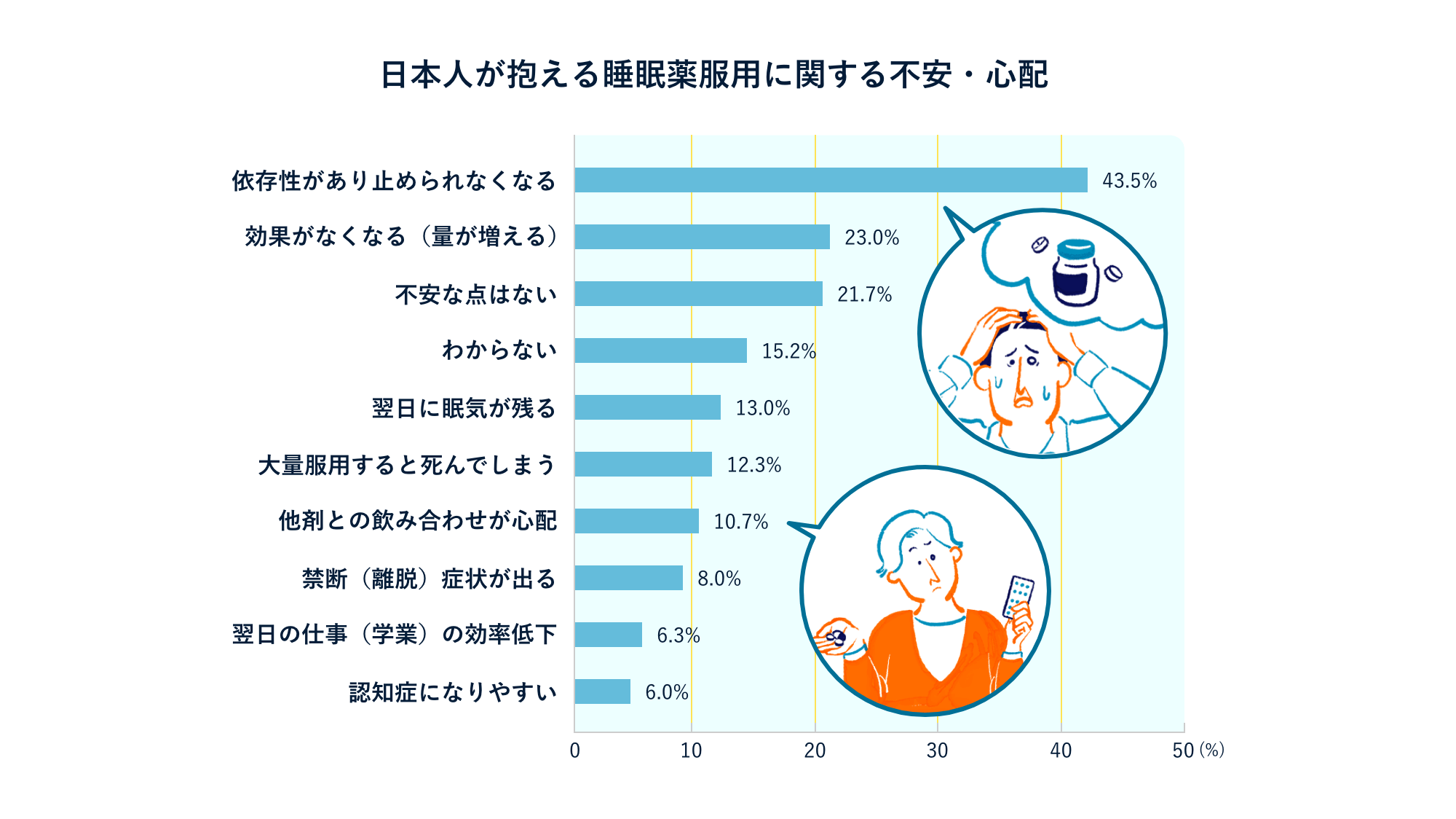ひと昔前ほどではないにせよ、今も睡眠薬に対する不安は根強いものがあります。一度使い始めるといつまで飲み続けるかわからず、治療のゴールが見えにくいこと、薬の特性や副作用に対する誤った理解などが不安の根底にあると考えられます。