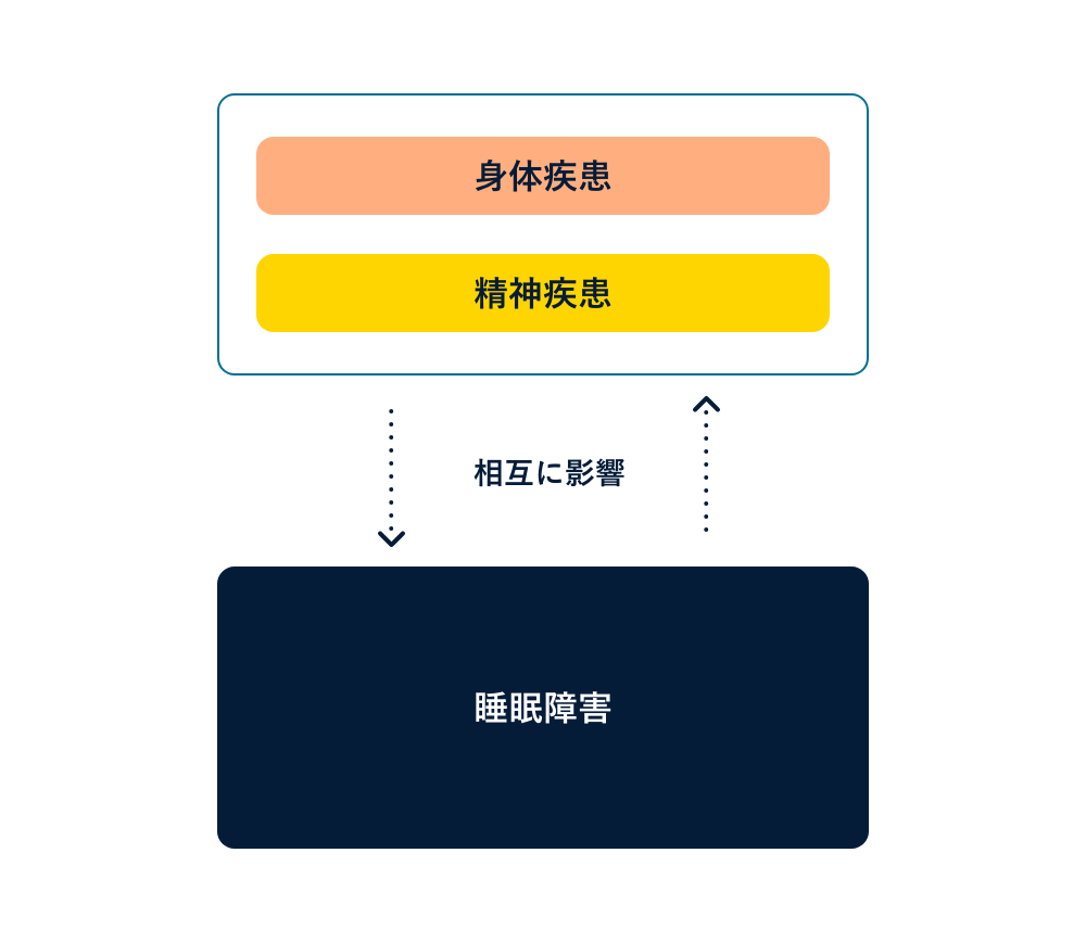 睡眠障害は、併存する身体疾患や精神疾患(併存疾患)と相互に影響し合う関係にありますが、併存疾患を治療できたとしても必ずしも睡眠障害を改善するわけではありません。したがって、不眠の症状がある場合は、不眠自体の対策をとることも大切です。