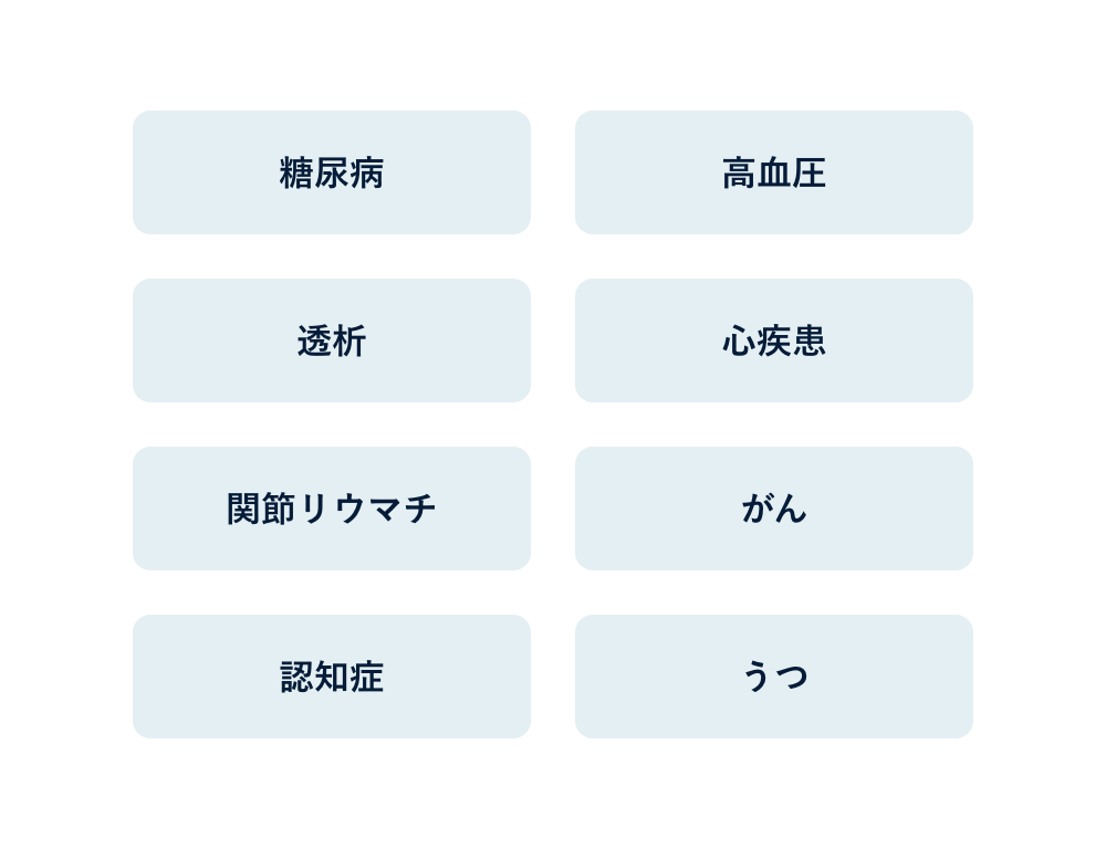 高血圧、高血圧や心臓病(胸苦しさ)、呼吸器疾患(咳・発作)、腎臓病・前立腺肥大(頻尿)、糖尿病、関節リウマチ(痛み)、アレルギー疾患(かゆみ)、脳出血、脳梗塞 など