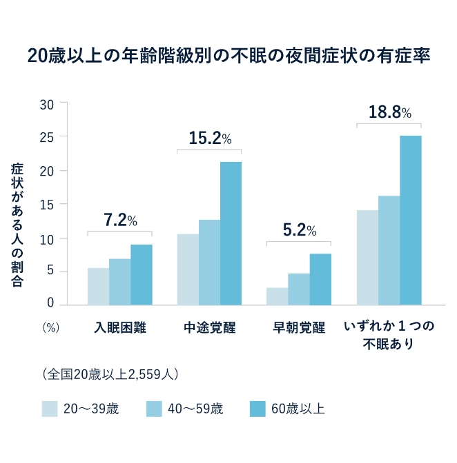 日本では、20歳以上の一般成人の7.2%が寝つきの悪さを体験していることが示されています(図)。入眠困難は、他の不眠症のタイプである中途覚醒や早朝覚醒に比べて、年齢による大きな頻度差は認められません1)。